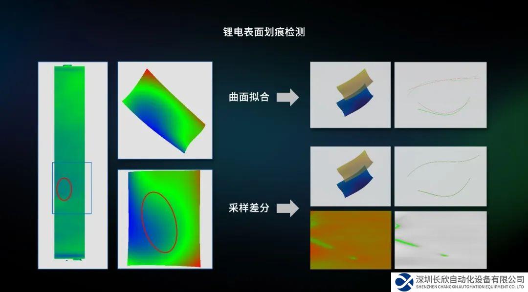 針對(duì)一些比較難檢測(cè)的細(xì)微劃痕,以長條鋰電池為例,用擬合的方式難以獲得理想的基準(zhǔn)面,Smart3視覺軟件推出一種基于鄰域采樣和差分的基準(zhǔn)面構(gòu)造方式,即通過上下采樣得到基準(zhǔn)面后,再與原始數(shù)據(jù)進(jìn)行差分,能夠精準(zhǔn)檢測(cè)任意方向、任意深度的劃痕。