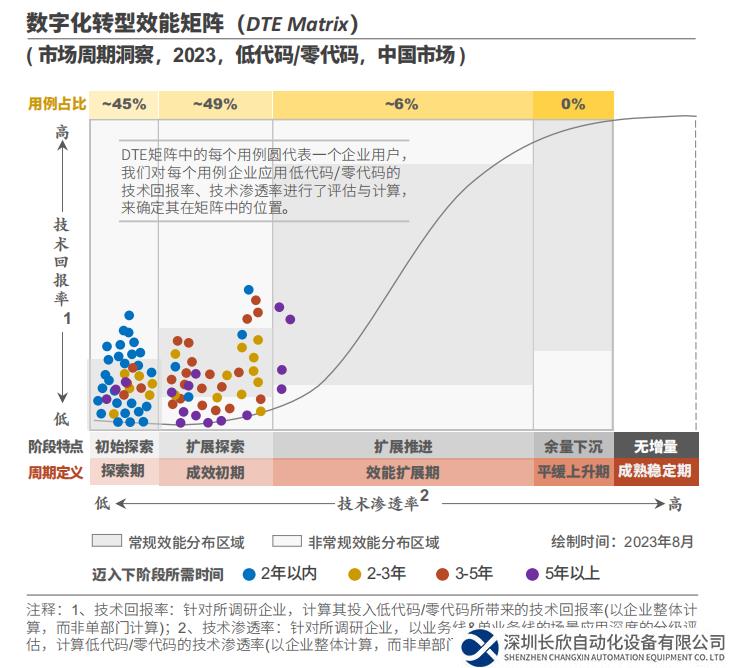 中國低代碼/零代碼擁有較大的待開掘機(jī)會(huì)空間;從DTE矩陣的周期定義來看,現(xiàn)階段的大部分實(shí)踐者處于探索期和成效初期階段。