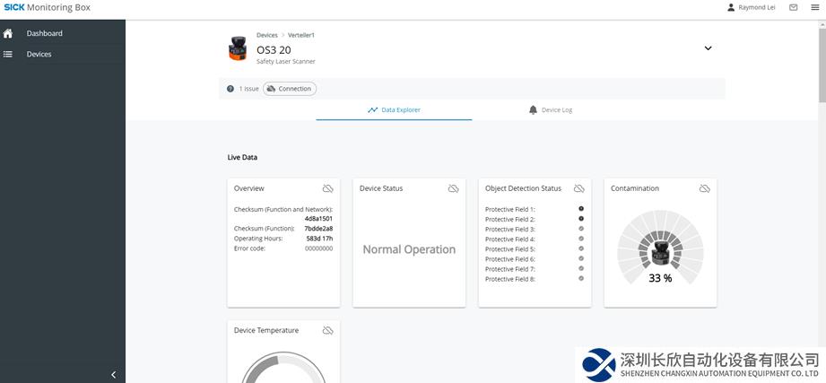 借助SICK Monitoring Box,您能非常方便的通過終端(例如電腦、手機等)訪問當前運行的設(shè)備信息,例如outdoorScan3當前的設(shè)備狀態(tài),診斷信息,數(shù)據(jù)統(tǒng)計以及預維護提示等等;方便我們對現(xiàn)場設(shè)備的了解以及管理。