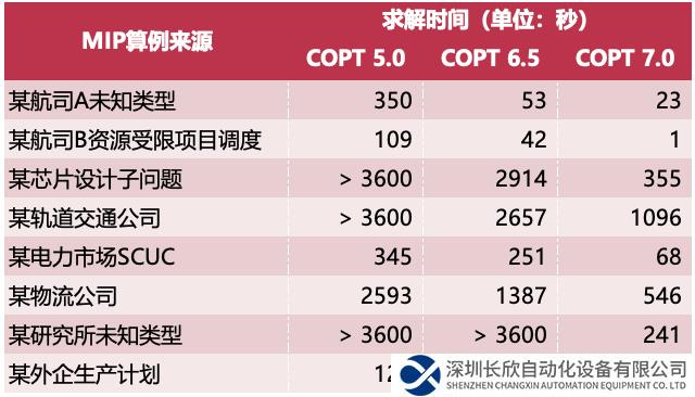 杉數(shù)求解器功能的不斷完善以及求解性能的持續(xù)提升,得益于在客戶項(xiàng)目中的落地實(shí)踐、經(jīng)驗(yàn)積累以及參數(shù)的不斷優(yōu)化。除公開(kāi)測(cè)評(píng)榜單之外,在多個(gè)領(lǐng)域的實(shí)際應(yīng)用中,COPT最新版本7.0的性能表現(xiàn)也有著顯著進(jìn)步,相比于去年發(fā)布的COPT 5.0版本,實(shí)現(xiàn)十倍至百倍的提升。以下是在真實(shí)MIP算例上,COPT各版本測(cè)試的求解時(shí)間對(duì)比: