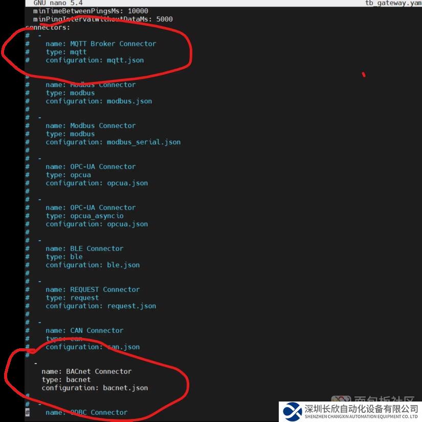1. 準(zhǔn)備打開/etc/thingsboard-gateway/config/tb_gateway.yaml,使能Bacnent Connector,注釋掉默認(rèn)的mqqt, 如下圖