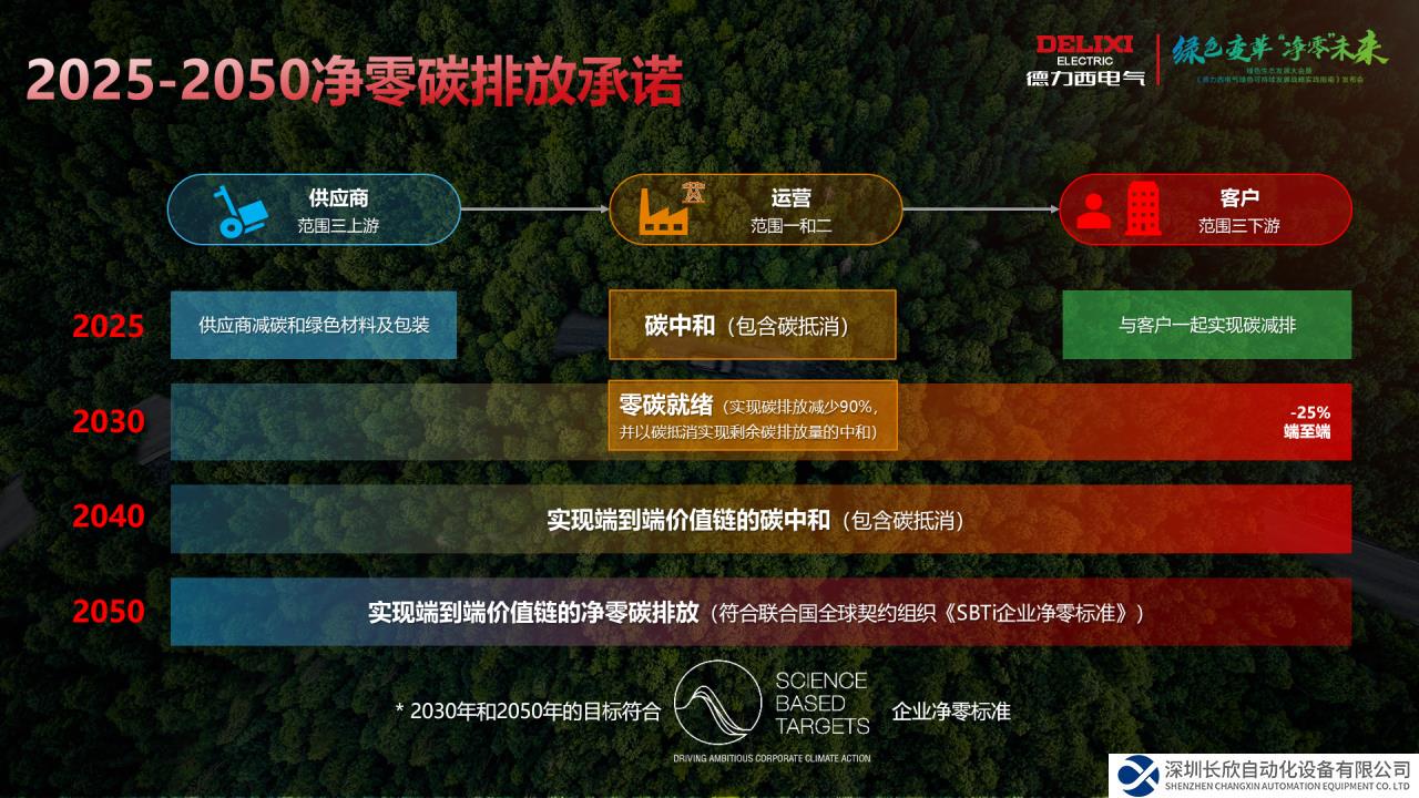 德力西電氣向社會(huì)莊嚴(yán)承諾,我們將在2025年實(shí)現(xiàn)運(yùn)營層面“碳中和”;2030年,實(shí)現(xiàn)運(yùn)營層面“零碳就緒”;2040年實(shí)現(xiàn)端到端價(jià)值鏈的“碳中和”;2050 年實(shí)現(xiàn)全價(jià)值鏈“凈零”碳排放。最終實(shí)現(xiàn)零事故、零排放,對環(huán)境和社會(huì)零影響。這是迄今為止,行業(yè)內(nèi)國際最高標(biāo)準(zhǔn)!比國內(nèi)同行領(lǐng)先平均3至5年時(shí)間!