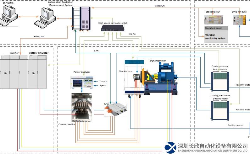 動(dòng)力總成測試由電池模擬器為被測試總成供電,輪邊測功機(jī)加載產(chǎn)生的電能,通過變頻器逆變后回饋到電網(wǎng)。高速電機(jī)測試由電池模擬器為被測試電機(jī)供電,高速測功機(jī)產(chǎn)生的電能通過變頻器逆變后回饋到電網(wǎng)。