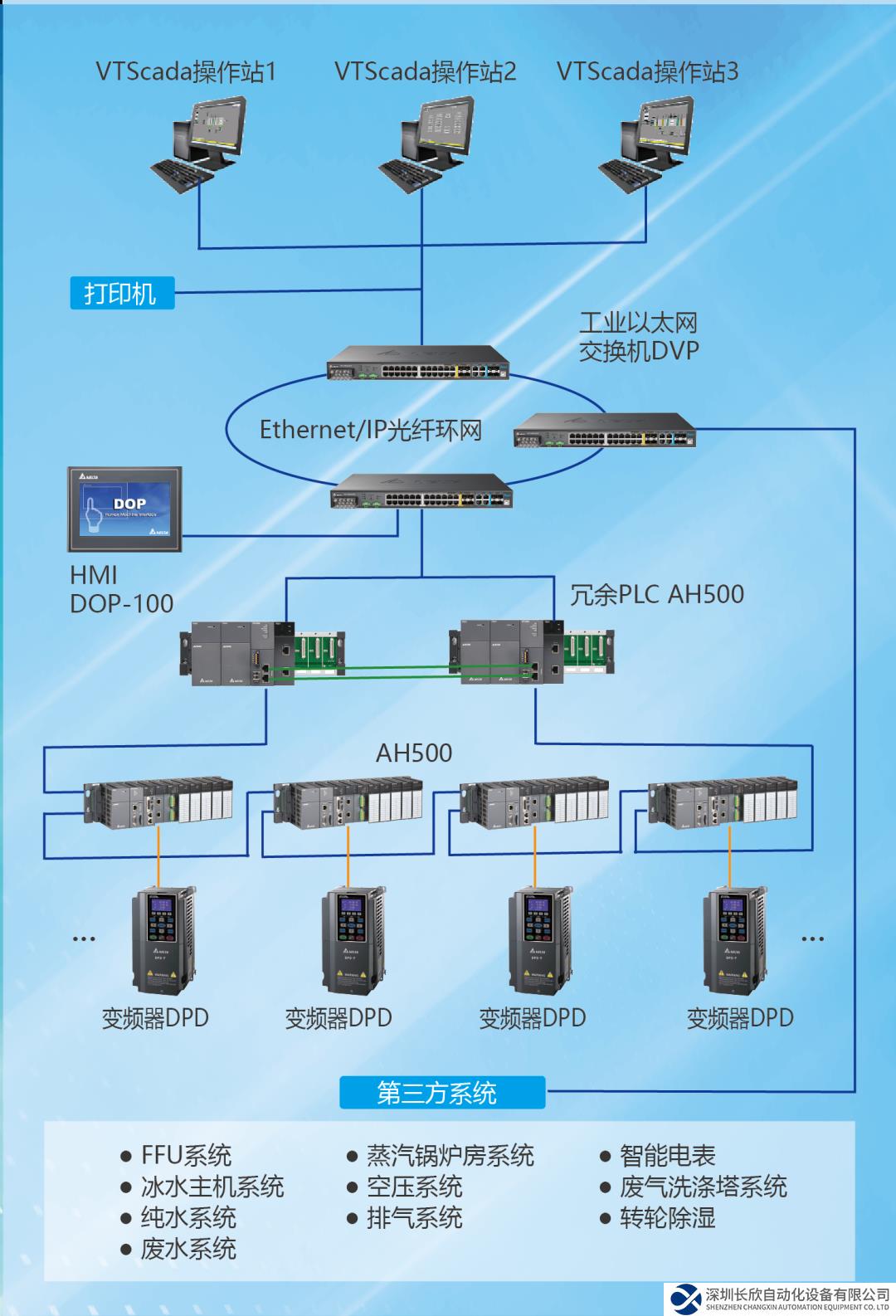 應(yīng)用冗余型PLC AH500搭載變頻器DPD組成冗余控制系統(tǒng),實(shí)現(xiàn)對(duì)空調(diào)系統(tǒng)、冷卻水塔等第三方系統(tǒng)的數(shù)據(jù)與流量調(diào)節(jié);聯(lián)動(dòng)主監(jiān)控系統(tǒng),進(jìn)行精密控制,為潔凈室的調(diào)溫、調(diào)濕等提供精細(xì)化控制。