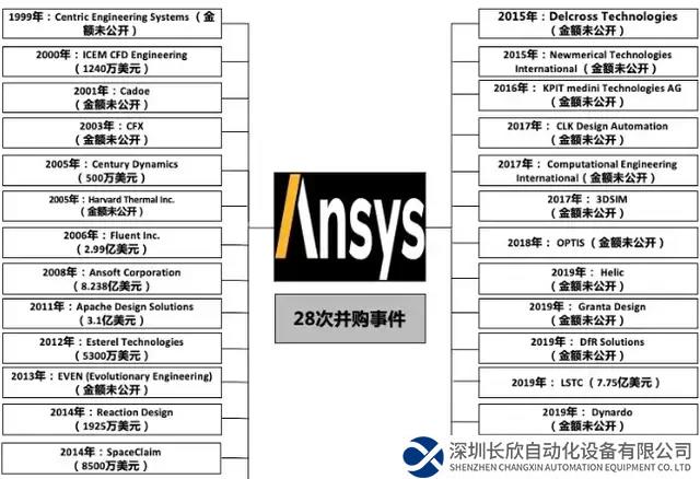 在Ansys公司的歷史上,也有著多大28次的并購(gòu)事件(如下圖)。其中2006年收購(gòu)了在流體仿真領(lǐng)域處于領(lǐng)導(dǎo)地位的美國(guó)Fluent公司,以及2008年收購(gòu)了在電路和電磁仿真領(lǐng)域處于領(lǐng)導(dǎo)地位的美國(guó)Ansoft公司。通過(guò)這幾次關(guān)鍵整合,Ansys公司成為全球最大的仿真軟件公司。