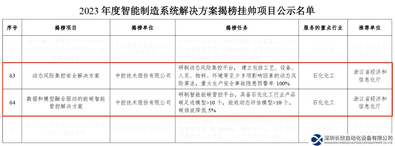 近日,中控技術(shù)股份有限公司(以下簡稱“中控技術(shù)”)的“動態(tài)風(fēng)險集控安全解決方案”和“數(shù)據(jù)和模型融合驅(qū)動的能碳智能管控解決方案”成功入選國家工信部公示的“2023年度智能制造系統(tǒng)解決方案揭榜掛帥項目名單”。