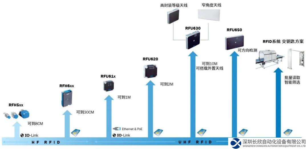 目前在售的從高頻到超高頻讀寫器標稱距離從3CM~10M,共計13款設備。從迷你型RFH5,到高性能型RFH6,再到超高頻經(jīng)濟款RFU610,高性能款RFU620和630共計5個系列。