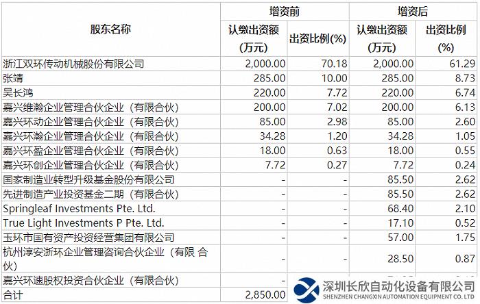 國家制造業(yè)轉(zhuǎn)型升級(jí)基金股份有限公司、先進(jìn)制造產(chǎn)業(yè)投資基金二期(有限合伙)出資比例各有2.62%;