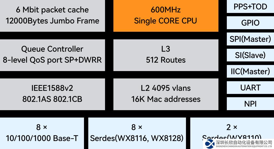 WX81XX系列芯片包含三款型號,分別是WX8110,WX8116和WX8128。該系列芯片是支持 L2/L3 單組播特性的以太網(wǎng)交換芯片,采用 40nm工藝,內(nèi)置8個10/100/1000 Base-T的PHY。其業(yè)務(wù)接口總交換性能分別為10Gbps、16Gbps和28Gbps,同時支持TSN特性,包括IEEE1588v2、IEEE802.1AS、IEEE802.1CB等。