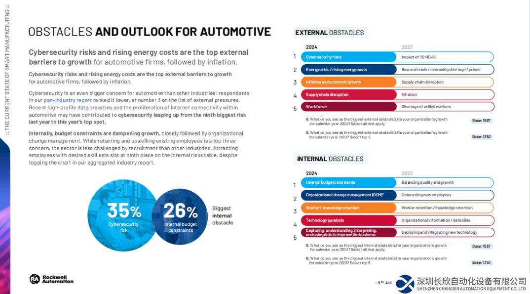 近日,作為工業(yè)自動(dòng)化、信息化和數(shù)字化轉(zhuǎn)型領(lǐng)域的全球領(lǐng)先企業(yè)之一,羅克韋爾自動(dòng)化發(fā)布第九版年度《智能制造現(xiàn)狀報(bào)告:汽車版》。這份全球調(diào)研共收到182位負(fù)責(zé)人的回復(fù),覆蓋來(lái)自15個(gè)主要制造業(yè)國(guó)家和地區(qū)的汽車制造商和汽車供應(yīng)商。