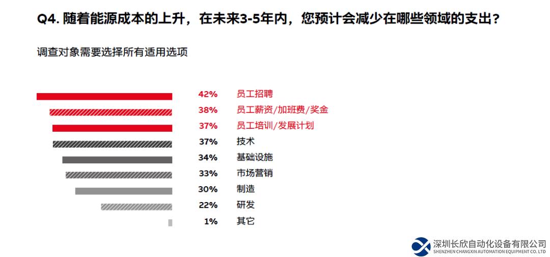 因能源成本上升和能源安全問題而導(dǎo)致投資減少的五大業(yè)務(wù)領(lǐng)域中,與人力資源相關(guān)的影響有三點(diǎn)。受訪企業(yè)表示為采取措施緩解能源成本上漲所帶來(lái)的影響,他們?cè)?022年減少了對(duì)人力資源的投資,這種情況甚至?xí)永m(xù)到未來(lái)的三到五年。隨著能源成本上漲,42%的企業(yè)表示將減少員工招聘,38%的企業(yè)將降低員工薪資、加班費(fèi)和獎(jiǎng)金,37%的企業(yè)將減少員工培訓(xùn)和員工發(fā)展計(jì)劃的投入。