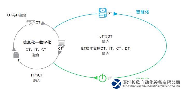 OT與IT融合可以打通邊界,提高OT工業(yè)設(shè)備和數(shù)據(jù)的可訪問性,從整體角度優(yōu)化業(yè)務(wù)流程。CT對串聯(lián)起整個生產(chǎn)流程信息流及運(yùn)用產(chǎn)生至關(guān)重要的作用。DT技術(shù)則進(jìn)行生產(chǎn)技術(shù)的賦能,優(yōu)化生產(chǎn)工業(yè),改善流程,而ET技術(shù)支撐OT、IT、CT、DT技術(shù)融合,保障生產(chǎn)的持續(xù)經(jīng)營。